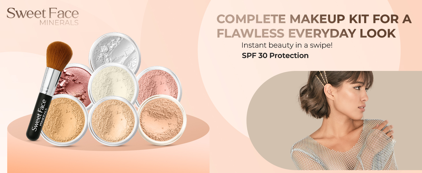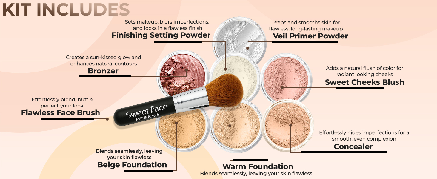 This Kit Includes 7 full size jars of Makeup and 1 Deluxe Face Brush: