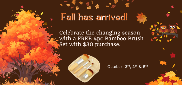 One 4pc Bamboo Brush Set with purchase of $30 or more begins on Friday, October 3, 2025 and ends on Sunday, October 5, 2025 and is only available on orders placed on our website at www.SweetFaceMinerals.com. No coupon code necessary and no need to add the brush set to your cart. As soon as we see your order of $30 or more, we will automatically include one free 4pc Bamboo Brush Set with your order.