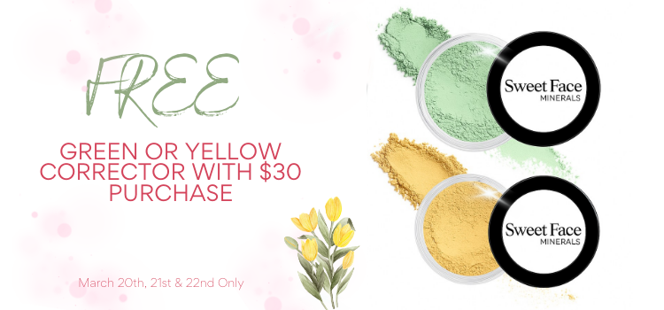 One free full size green or yellow corrector with $30 purchase begins on Friday, March 20, 2026 and ends on Sunday, March 22, 2026 and is only available on our website at www.SweetFaceMinerals.com. Add $30 or more to your cart, then leave us a note at checkout if you want Green or Yellow Corrector and we will include it with your order. If you do not specify which one you would like, we will choose one for you based off of the other items in your cart. No coupon code necessary.